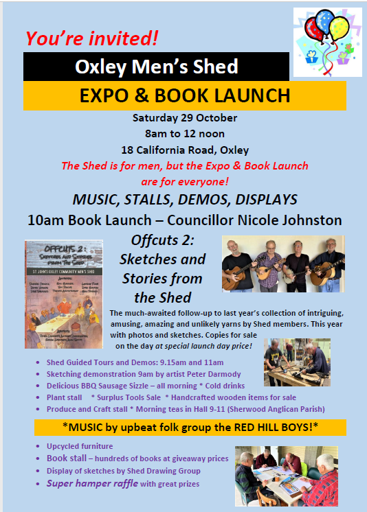 29 October: Launch of Offcuts 2: Sketches and stories from the Shed @ Oxley Men’s Shed by Councillor Nicole Johnston