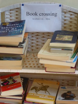 In Italy, boarding a train in the small mountainside village of Santa Maria Maggiore in the north-west, I saw a collection of ‘swap’ books at the station, using the English term, ‘Book crossing’, and an explanation (I assume) in Italian below.